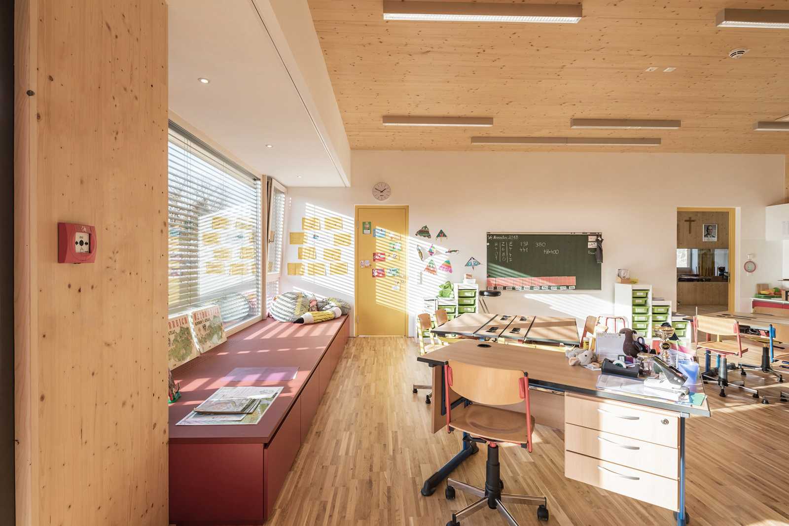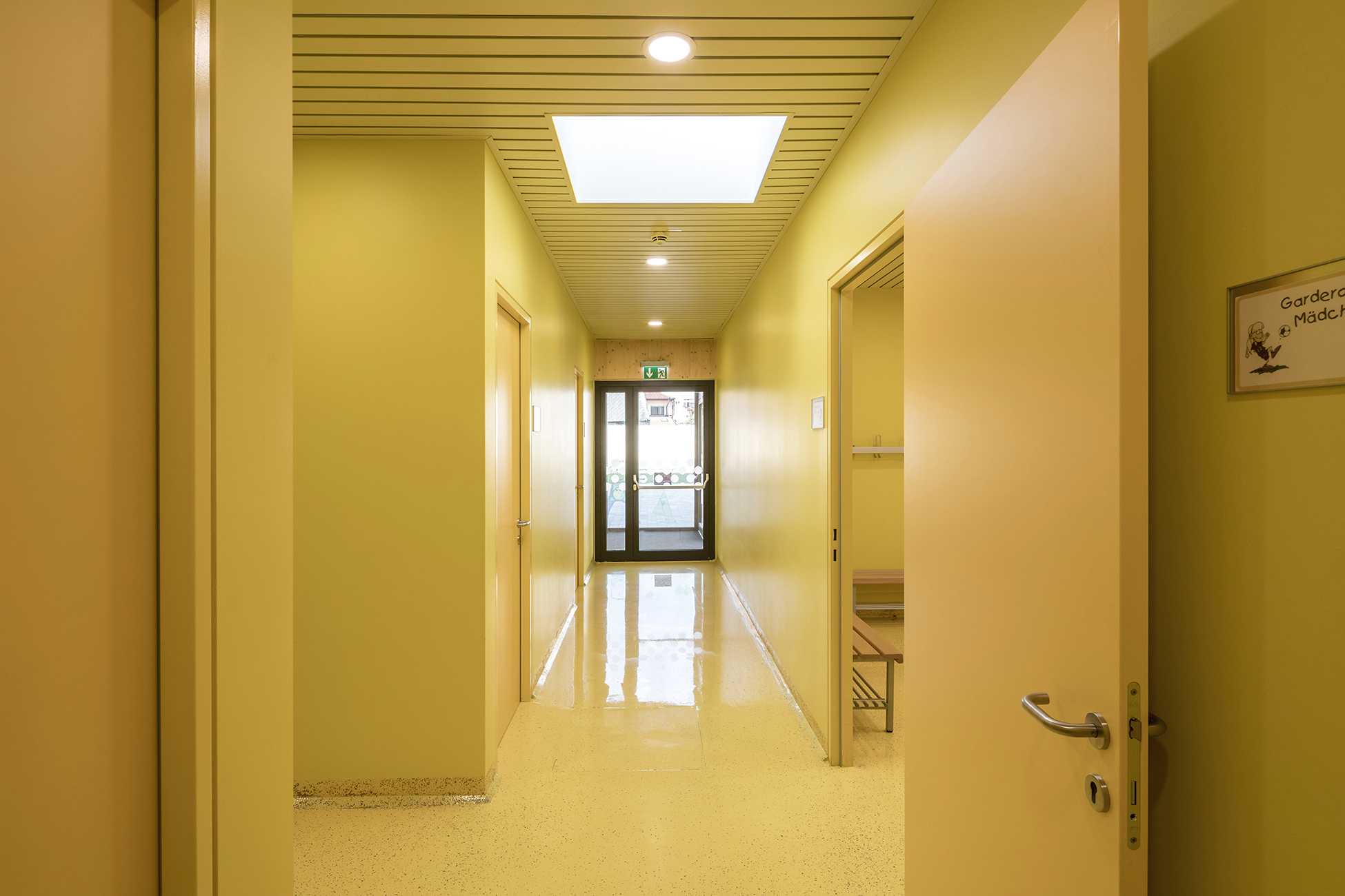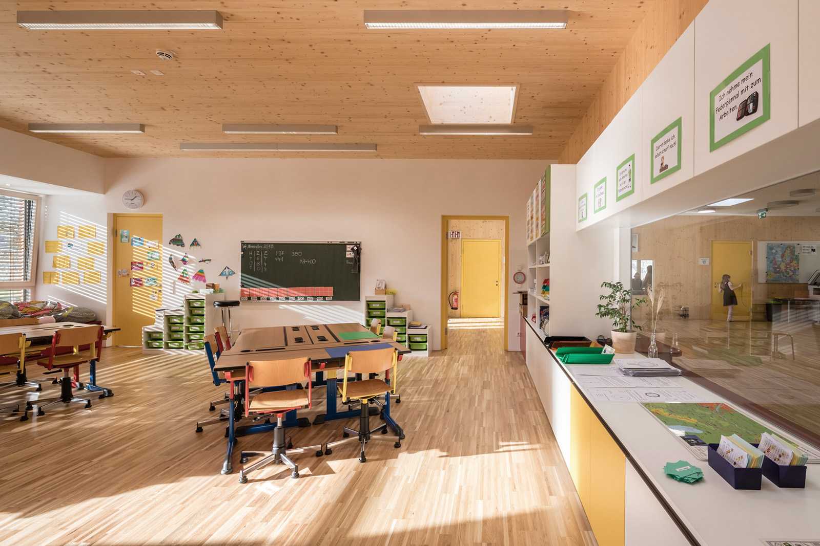 Barrierefreiheit, pädagogisch gesuchte Blickkontakte und Ausgänge in Garten und Pausenhof vereinen viele Vorteile des Lernens und Spielens auf einer Ebene.