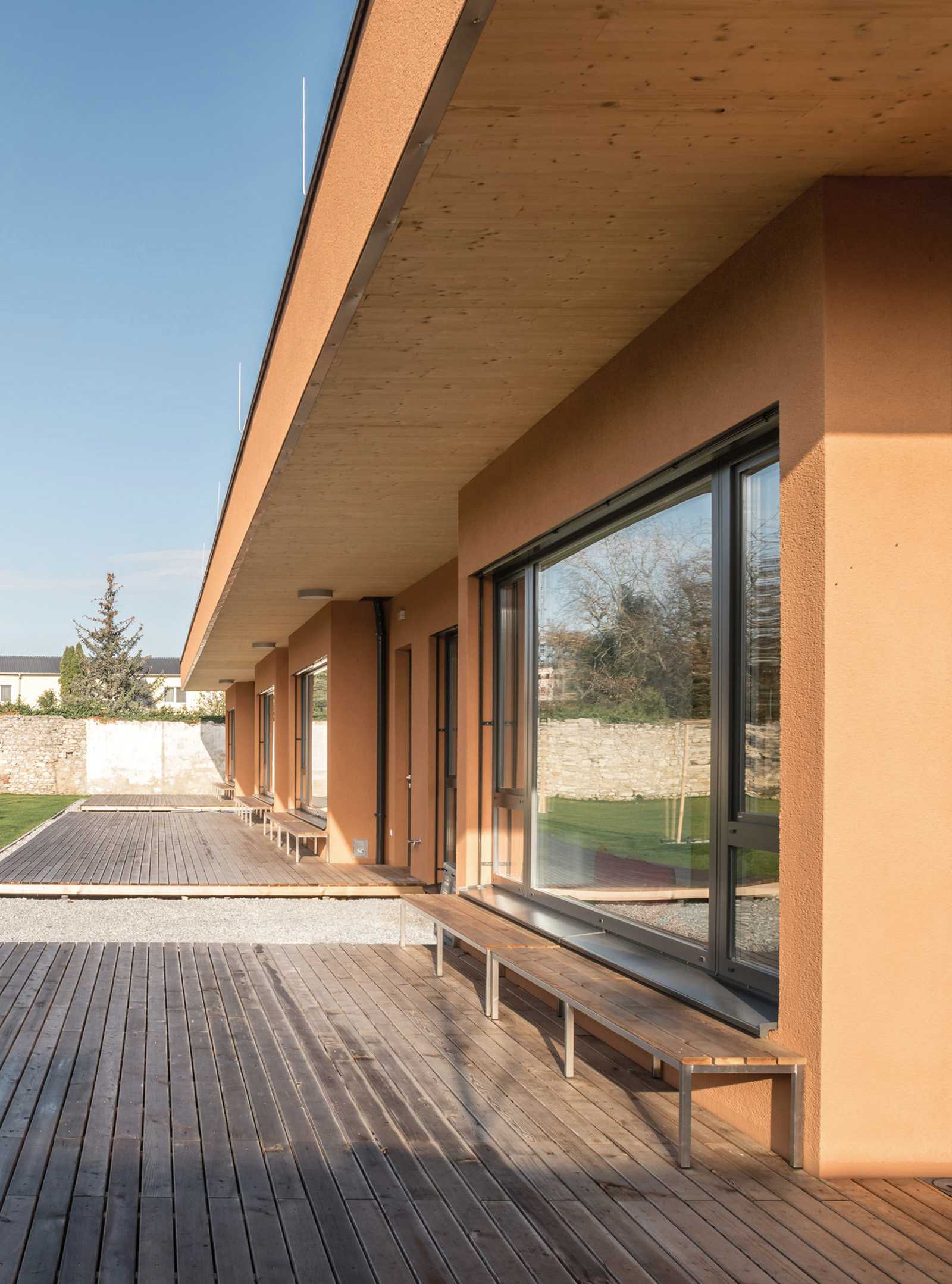 Der eingeschossige Baukörper ist übersichtlich und kindgerecht organisiert. Die Ausrichtung der Klassen gegen Südwesten, mit den vorgelagerten, teilweise überdeckten Freiklassen zum Grünraum, ermöglichen einen direkten Außenkontakt. Zugangsseitig befindet sich als Kopf der Anlage der Turnsaal.