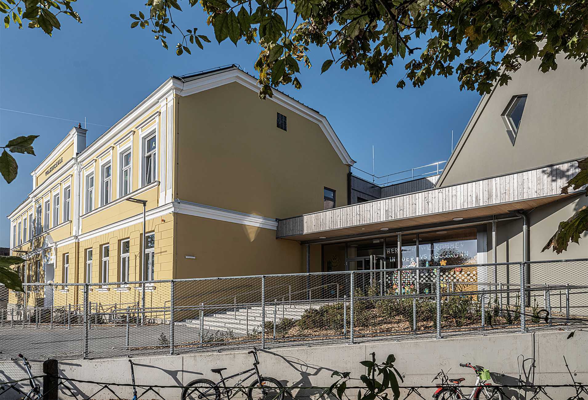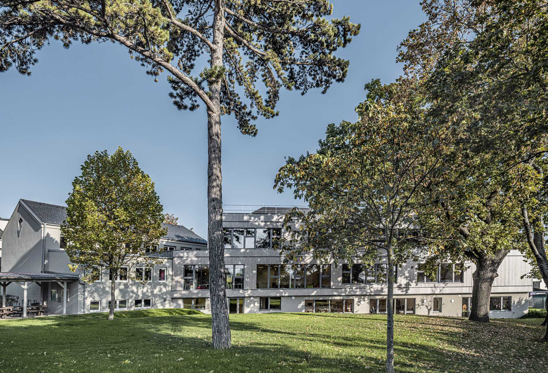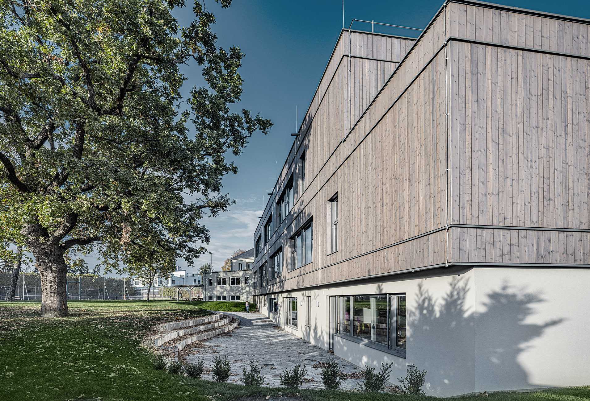 Die neue Schulerweiterung ist gartenseitig angelagert und steht in respektvoller Symbiose zum Altbestand. Qualitätsvolles aus dem Bestand wird übernommen, Neues steht für zeitgemäßes Weiterbauen. An der Nahtstelle zwischen Massiv- und Holzbau (Alt- und Neubau) schaffen Lichtbänder, Lufträume und Kaskadentreppe Großzügigkeit und Transparenz. Viel natürliches Licht sorgt für gute Lichtverhältnisse und interessante Innen-Außen-Bezüge, vor allem die Blickbeziehung auf die 100-jährige Eiche im Schulgarten.