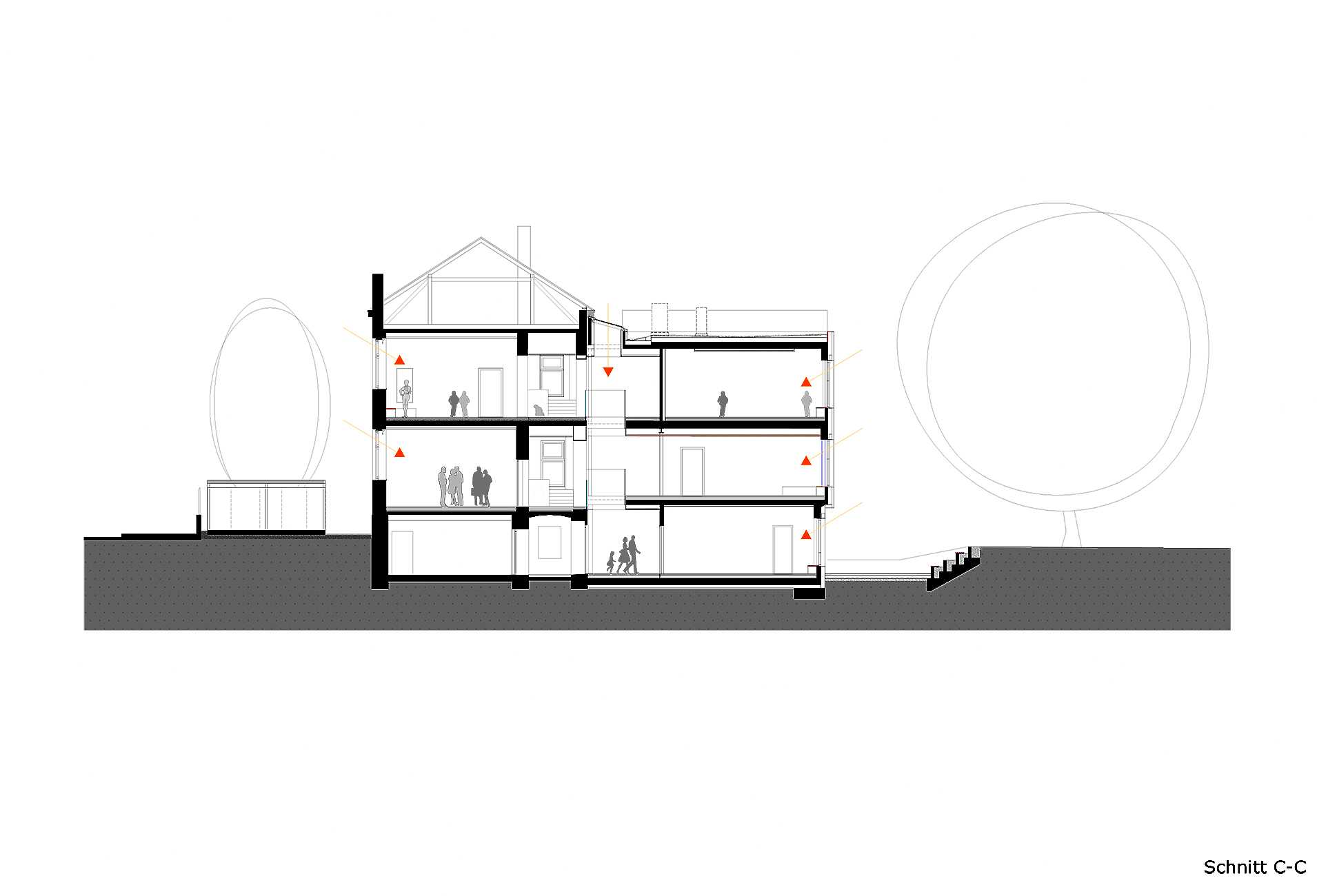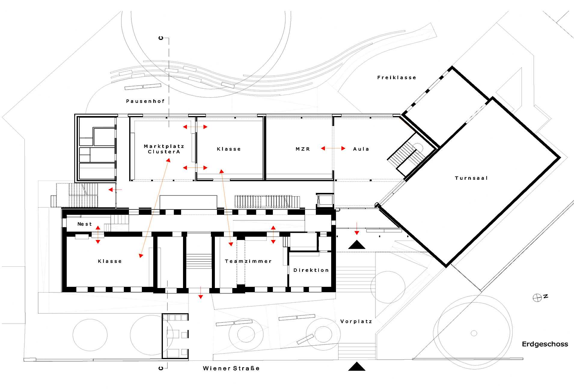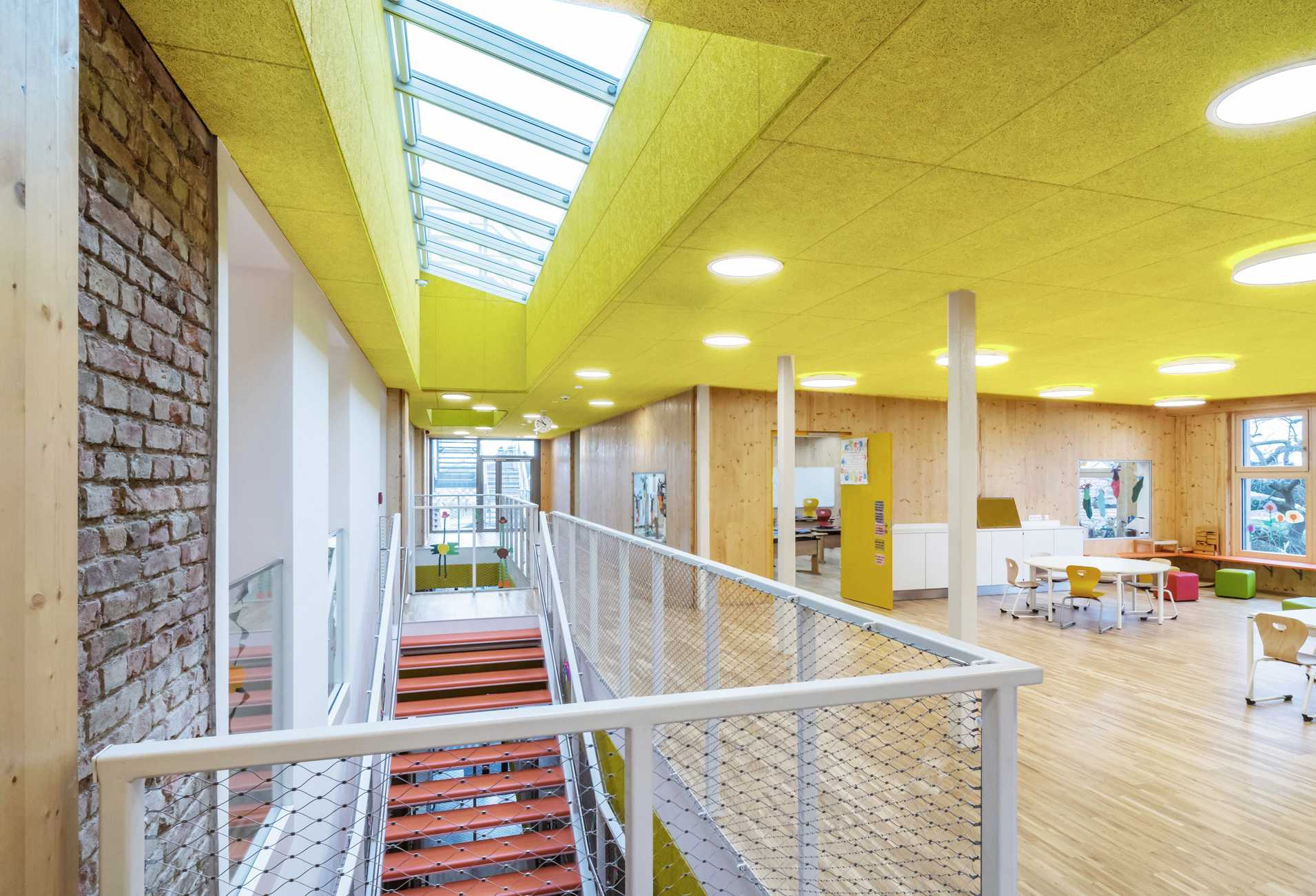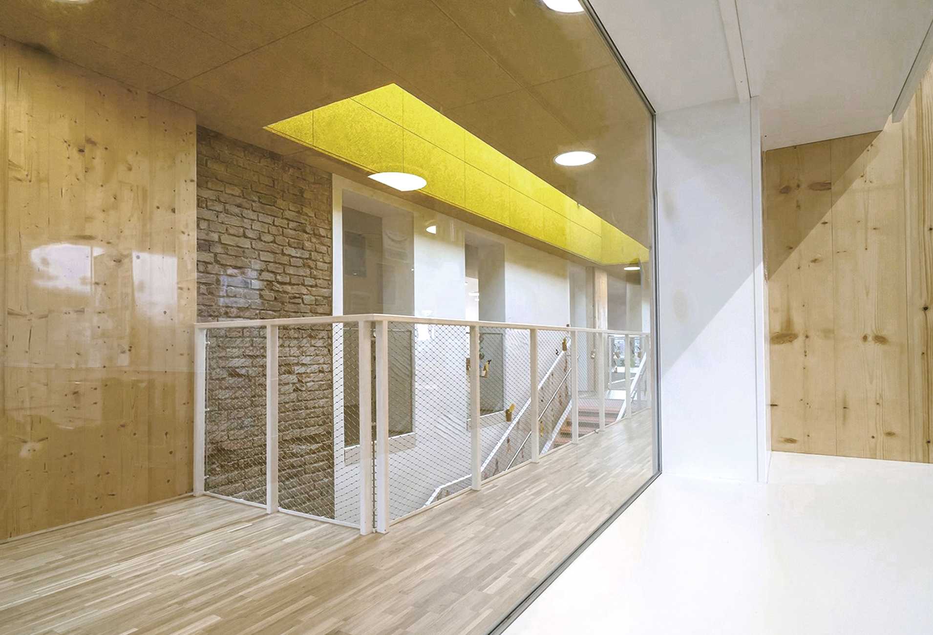 Die neue Schulerweiterung ist gartenseitig angelagert und steht in respektvoller Symbiose zum Altbestand. Qualitätsvolles aus dem Bestand wird übernommen, Neues steht für zeitgemäßes Weiterbauen. An der Nahtstelle zwischen Massiv- und Holzbau (Alt- und Neubau) schaffen Lichtbänder, Lufträume und Kaskadentreppe Großzügigkeit und Transparenz. Viel natürliches Licht sorgt für gute Lichtverhältnisse und interessante Innen-Außen-Bezüge, vor allem die Blickbeziehung auf die 100-jährige Eiche im Schulgarten.