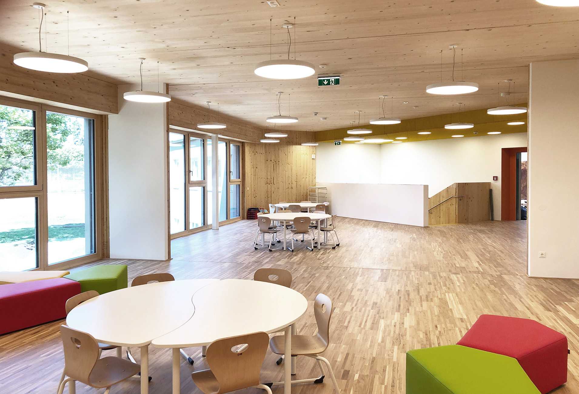 Der dreigeschossige Neubau besteht aus einem massiven Gartengeschoss und zwei Obergeschossen in Holzmassivbauweise mit silbrig schimmernder Holzfassade. Horizontale Linien durch Fassadentrennbleche im Gegensatz zur vertikalen Holzschalung prägen das Fassadenbild des Neubaus. Integrale Planung, überwiegend trockene Bauweise und Vorfertigung machen eine schnelle Bauzeit realisierbar. Ziel war einerseits möglichst viel Holz im Inneren sichtbar zu lassen, andererseits dabei Schallschutz, Akustik, große Spannweiten (Verwendung von Holz-Beton-Verbunddecken) zu berücksichtigen und eine gute und behagliche Lernatmosphäre zu gewährleisten.