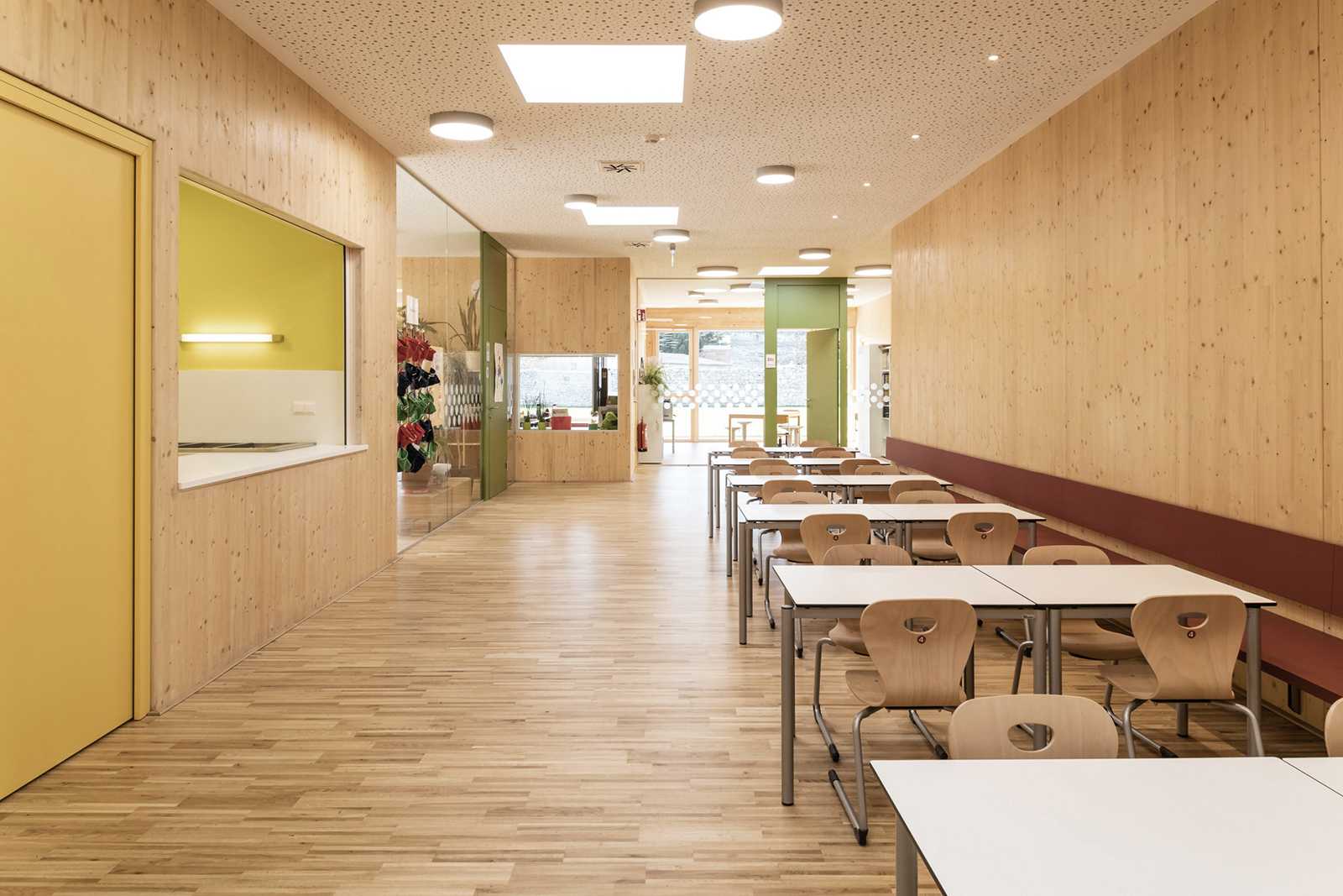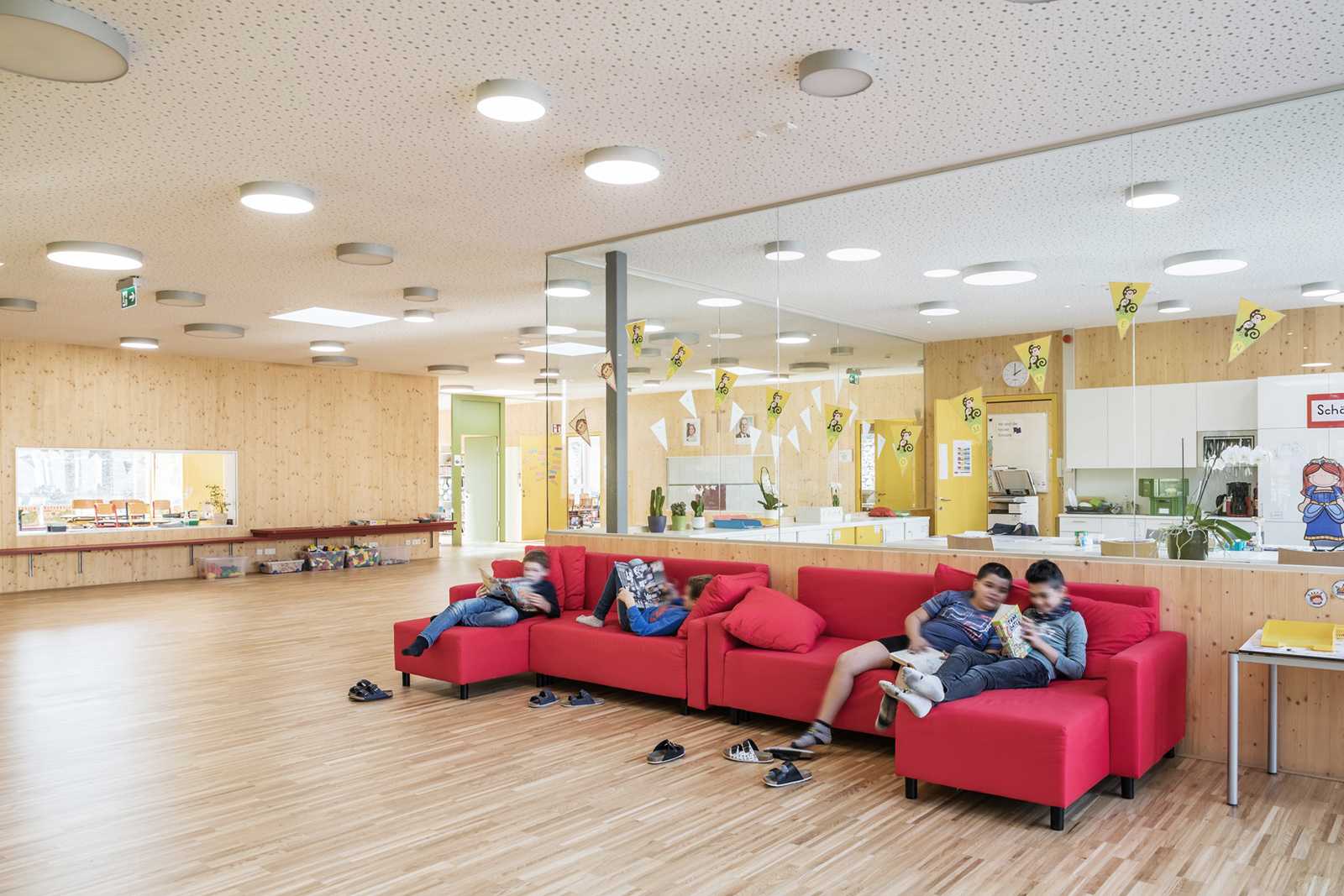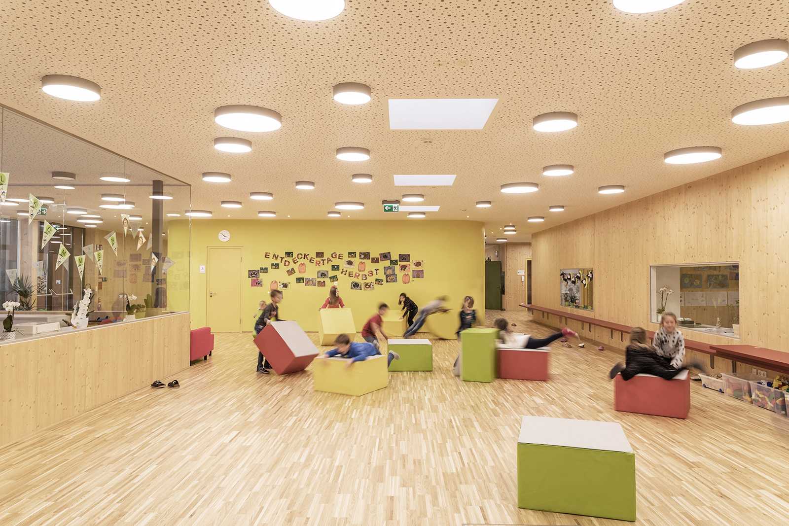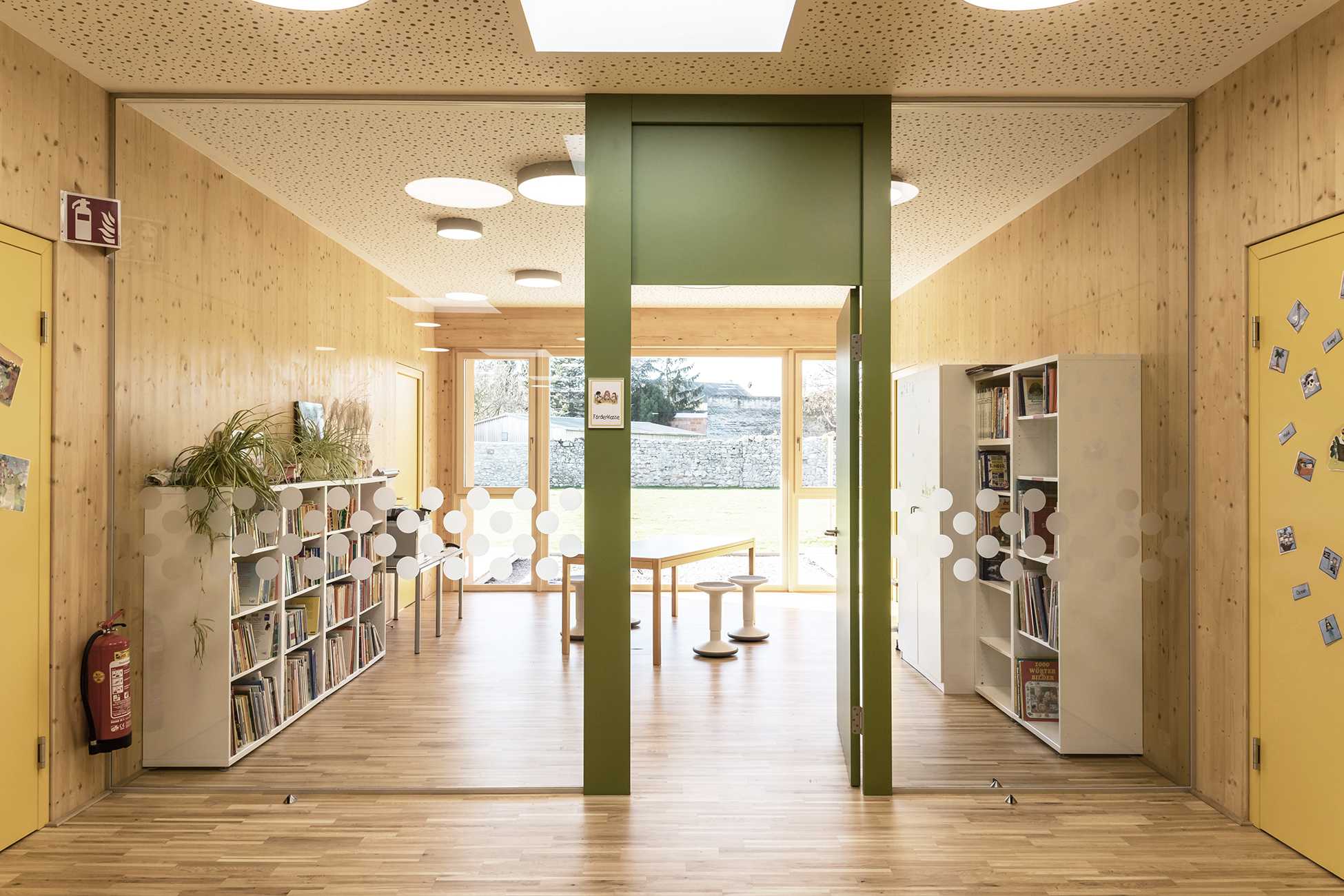 Barrierefreiheit, pädagogisch gesuchte Blickkontakte und Ausgänge in Garten und Pausenhof vereinen viele Vorteile des Lernens und Spielens auf einer Ebene.