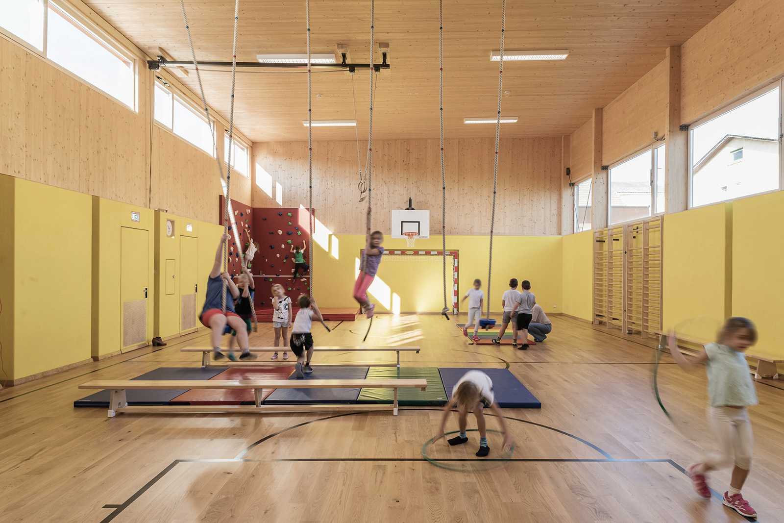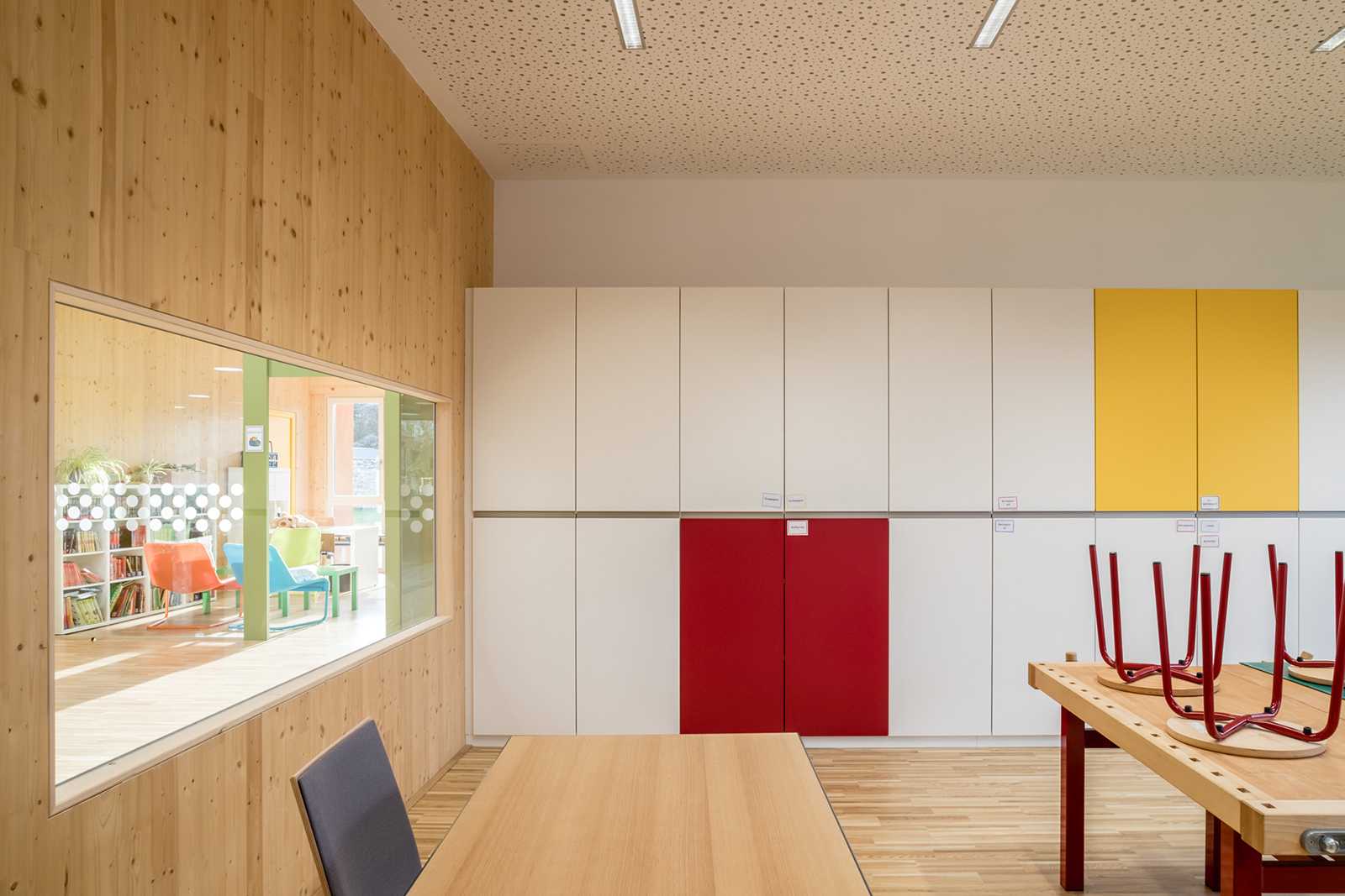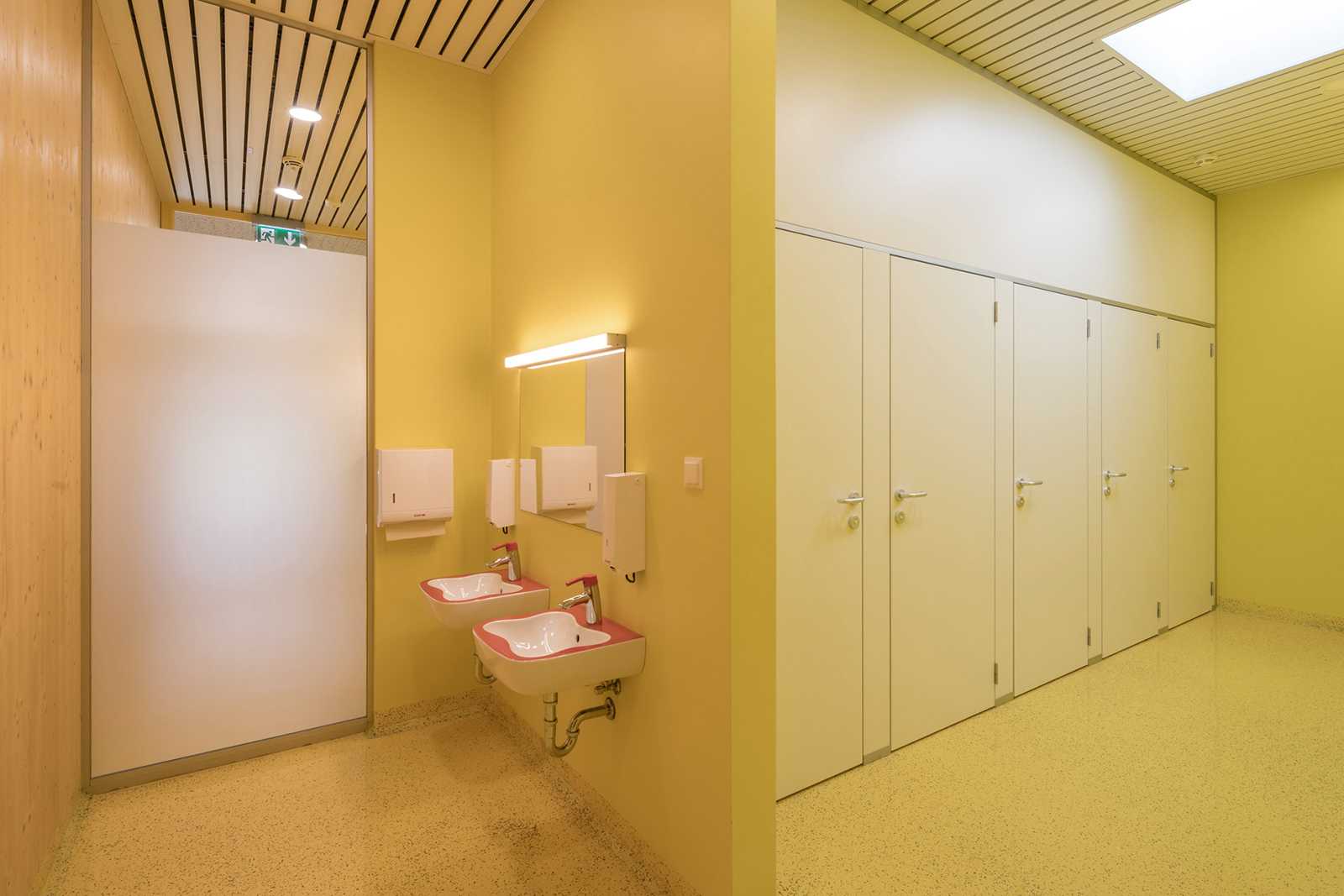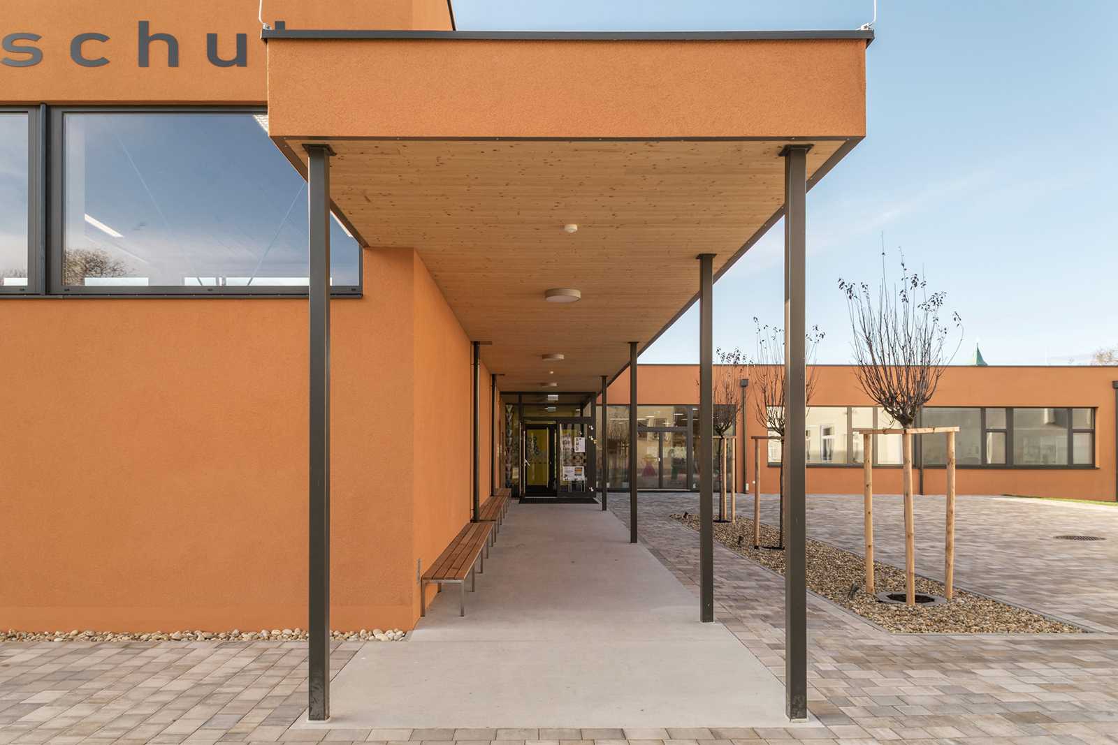 Der eingeschossige Baukörper ist übersichtlich und kindgerecht organisiert. Die Ausrichtung der Klassen gegen Südwesten, mit den vorgelagerten, teilweise überdeckten Freiklassen zum Grünraum, ermöglichen einen direkten Außenkontakt. Zugangsseitig befindet sich als Kopf der Anlage der Turnsaal.