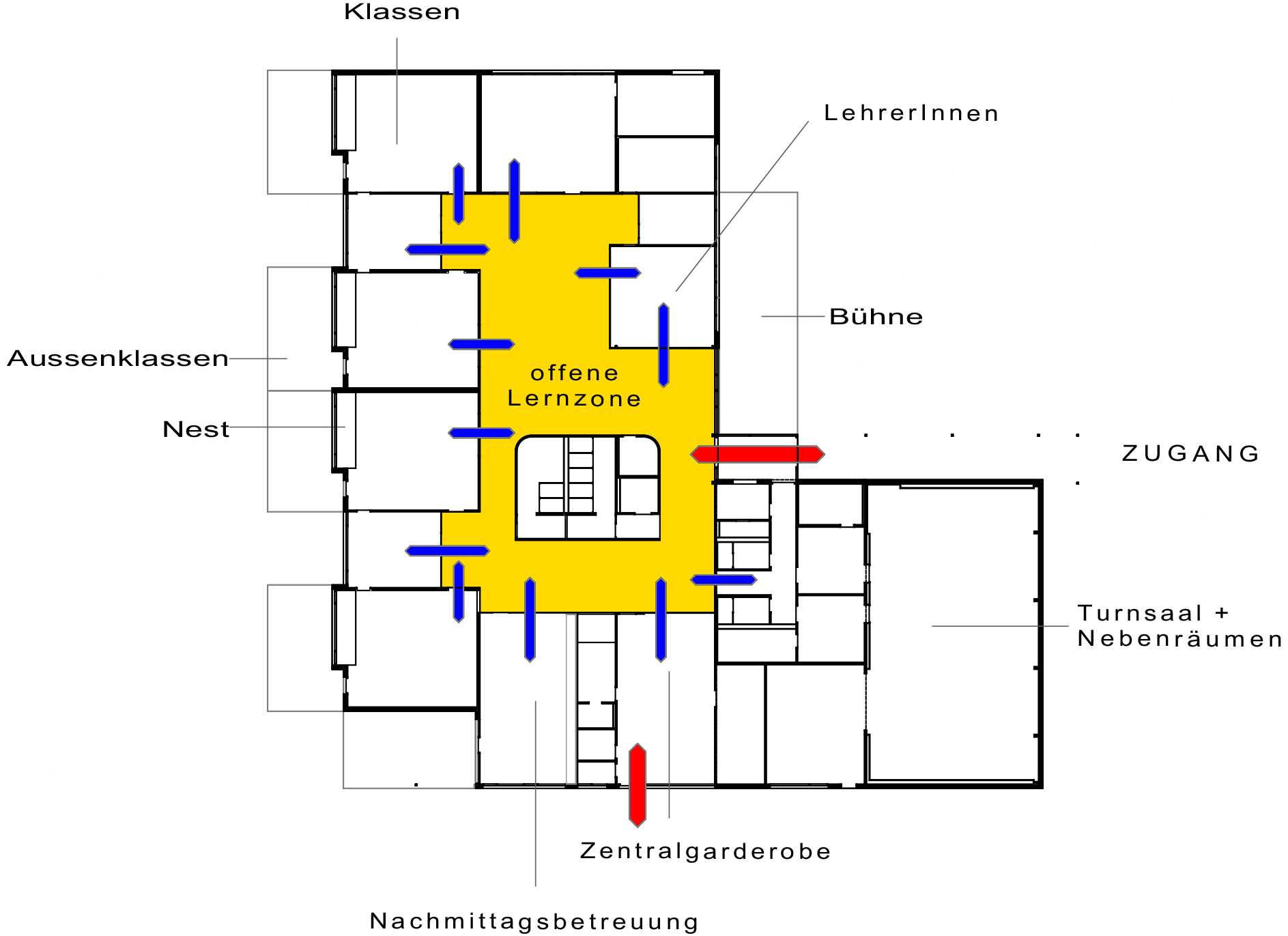 Das Herz der Schule wird durch einen „Marktplatz" (offene Lernzone, Pausenraum, Aula etc.) gebildet. Alle Bildungsräume sind um den Marktplatz im Clusterkonzept organisiert.