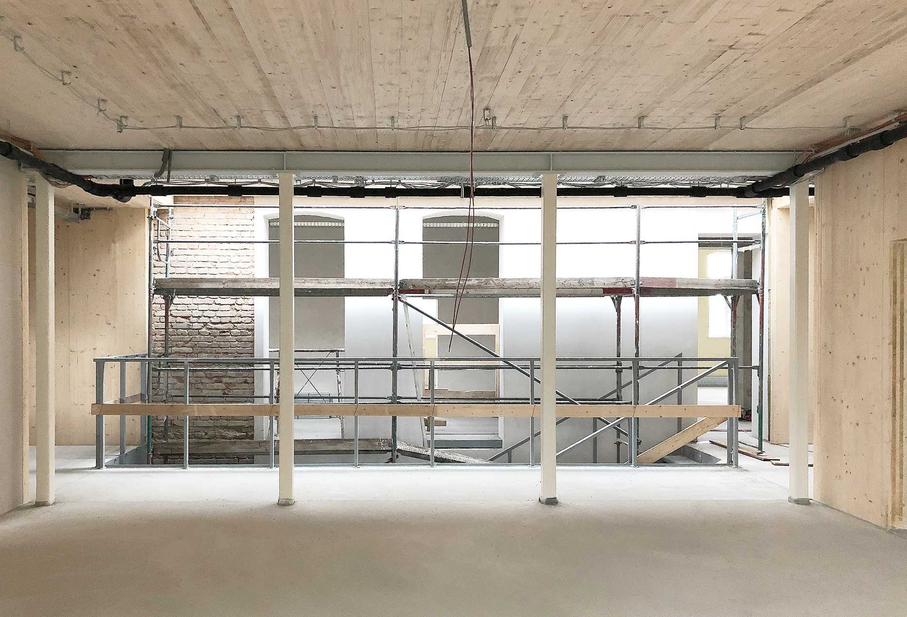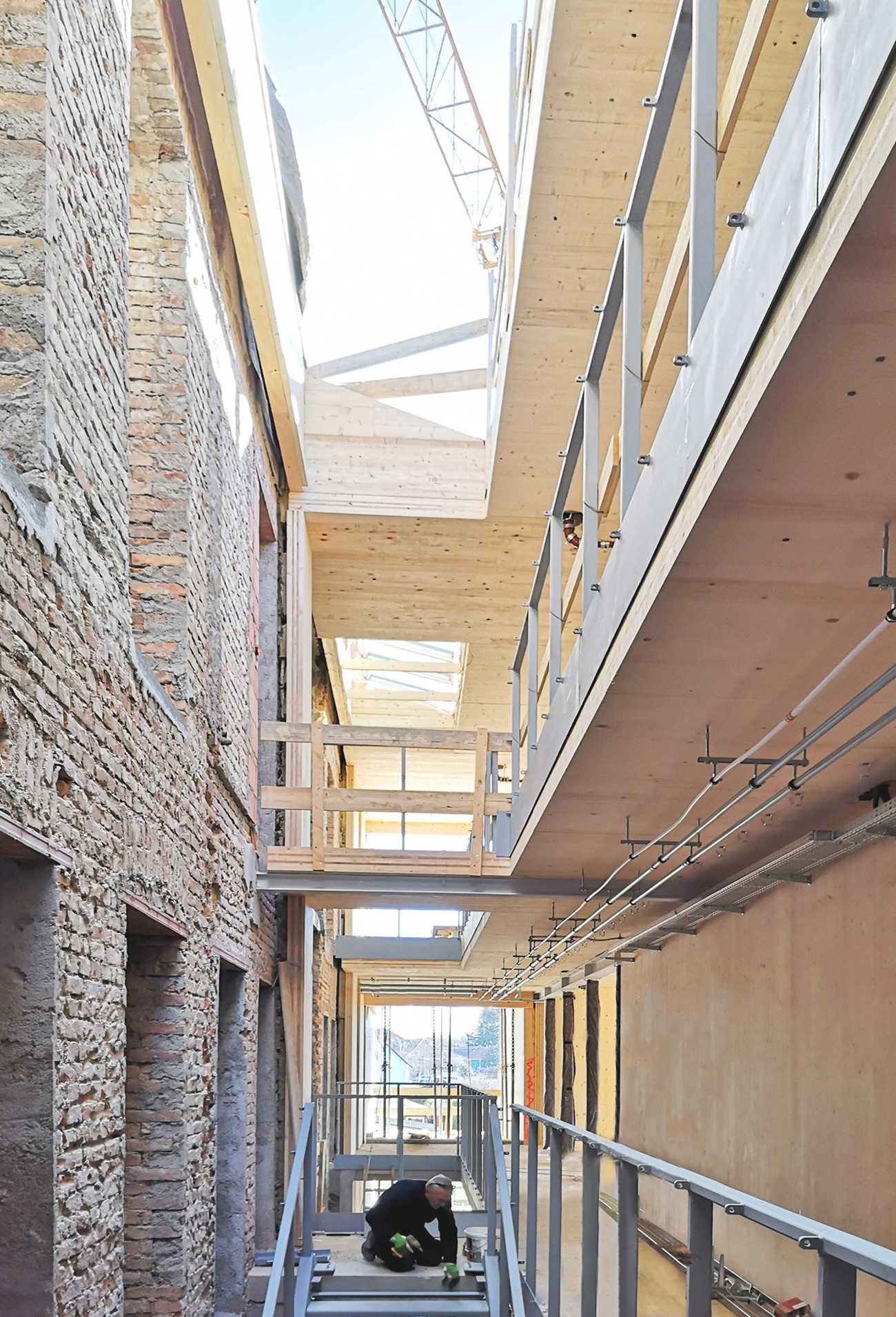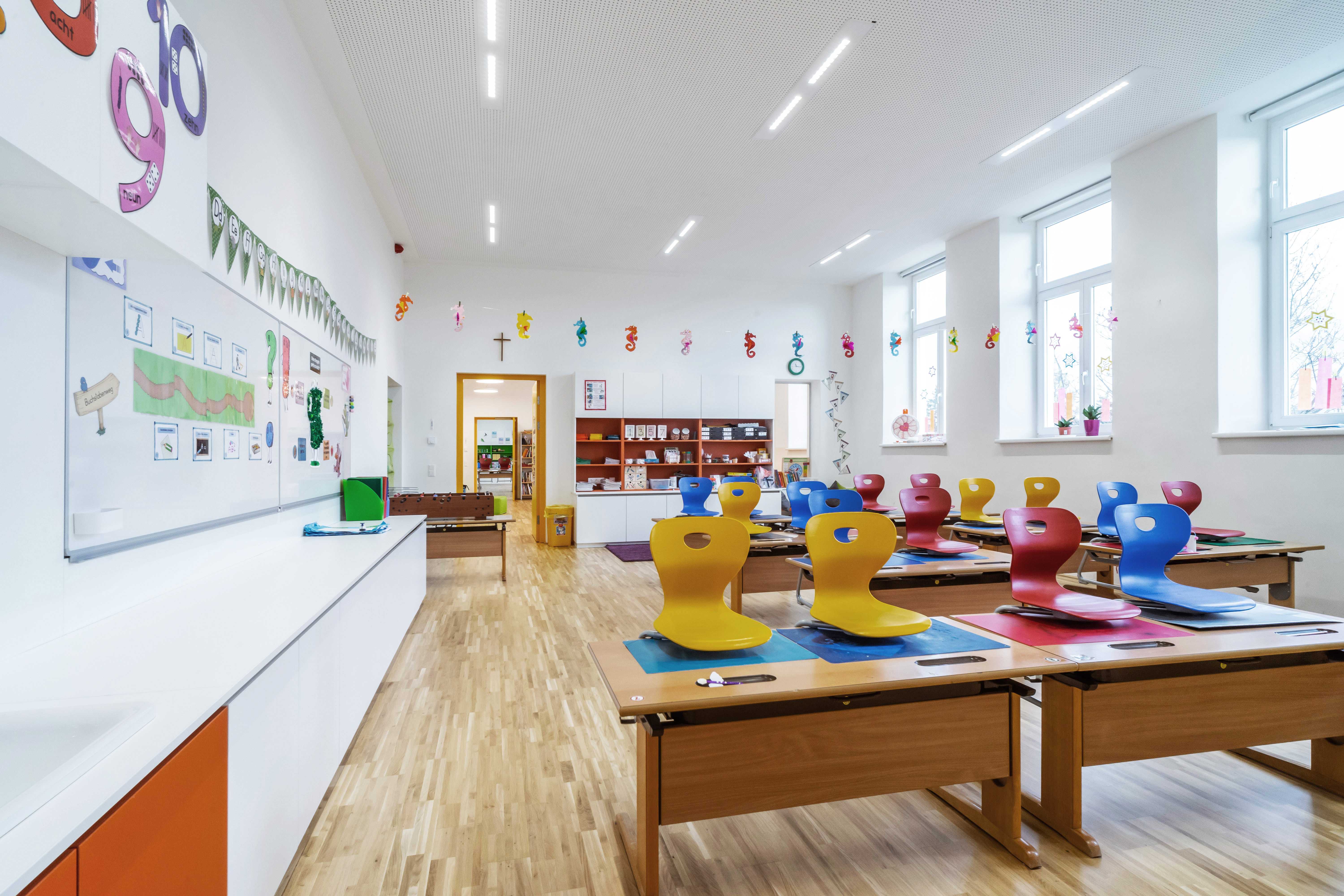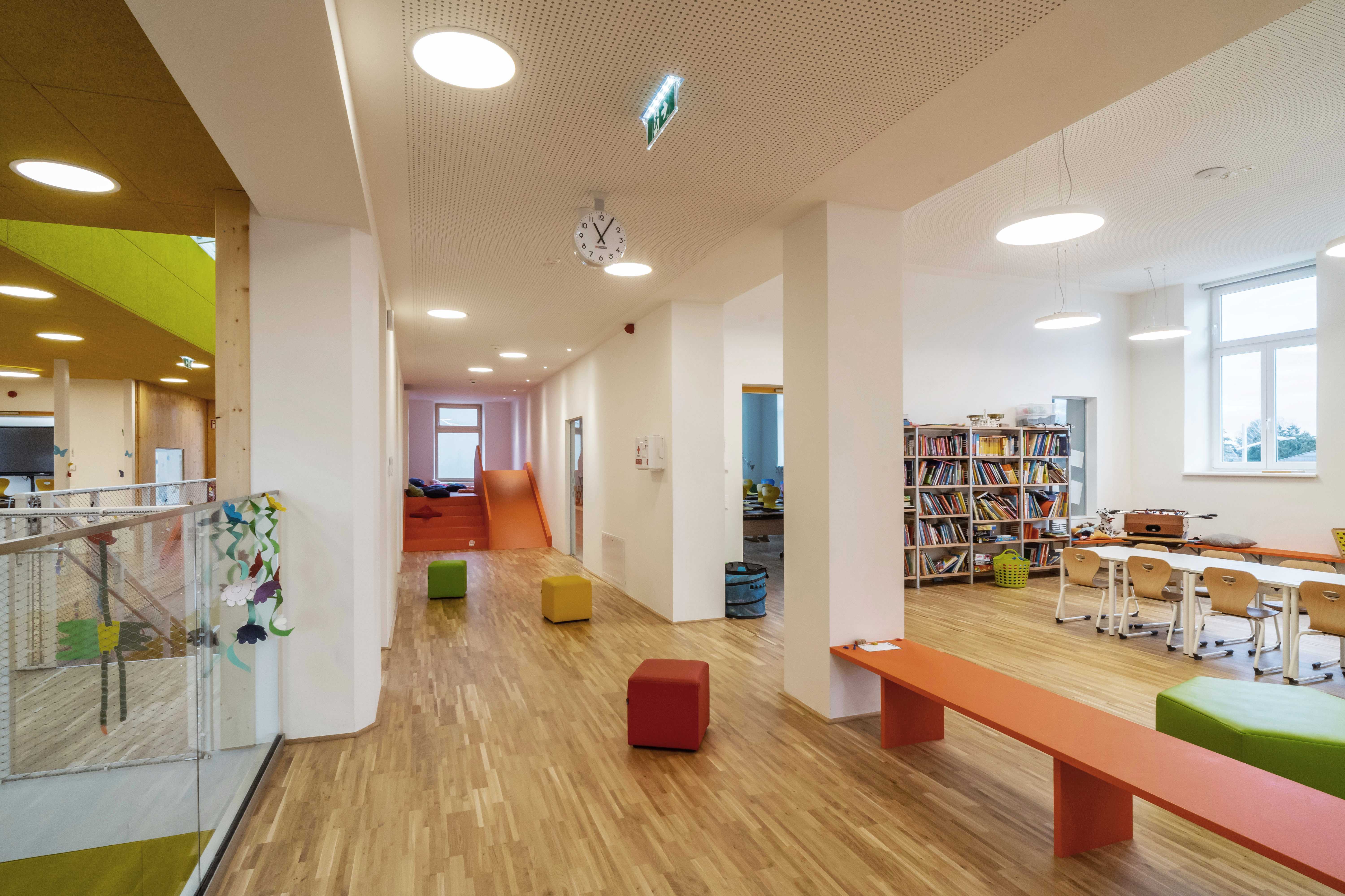 Die neue Schulerweiterung ist gartenseitig angelagert und steht in respektvoller Symbiose zum Altbestand. Qualitätsvolles aus dem Bestand wird übernommen, Neues steht für zeitgemäßes Weiterbauen. An der Nahtstelle zwischen Massiv- und Holzbau (Alt- und Neubau) schaffen Lichtbänder, Lufträume und Kaskadentreppe Großzügigkeit und Transparenz. Viel natürliches Licht sorgt für gute Lichtverhältnisse und interessante Innen-Außen-Bezüge, vor allem die Blickbeziehung auf die 100-jährige Eiche im Schulgarten.