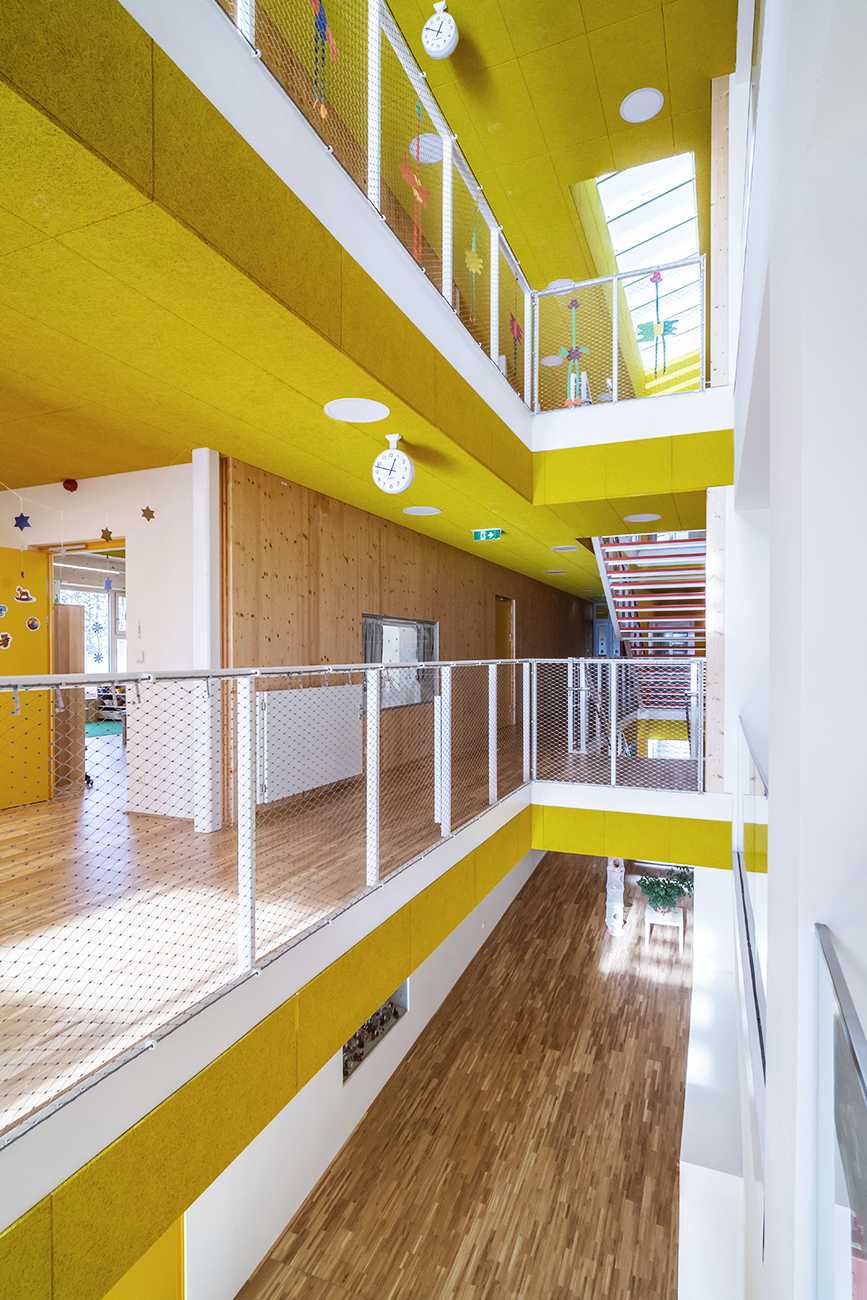 Der dreigeschossige Neubau besteht aus einem massiven Gartengeschoss und zwei Obergeschossen in Holzmassivbauweise mit silbrig schimmernder Holzfassade. Horizontale Linien durch Fassadentrennbleche im Gegensatz zur vertikalen Holzschalung prägen das Fassadenbild des Neubaus. Integrale Planung, überwiegend trockene Bauweise und Vorfertigung machen eine schnelle Bauzeit realisierbar. Ziel war einerseits möglichst viel Holz im Inneren sichtbar zu lassen, andererseits dabei Schallschutz, Akustik, große Spannweiten (Verwendung von Holz-Beton-Verbunddecken) zu berücksichtigen und eine gute und behagliche Lernatmosphäre zu gewährleisten.
