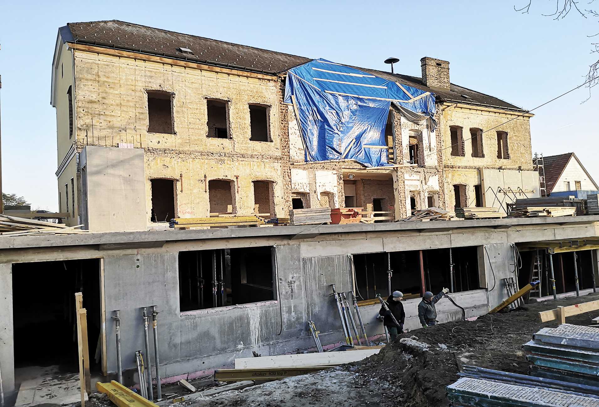Die historische Volksschule Moosbrunn prägt das vertraute Bild der Wienerstraße. Bei der Adaptierung und Erweiterung des Bestandes steht heimisches Holz (Brettsperrholzbauweise) im Vordergrund. Zwischen alter Schule und bestehendem Turnsaal aus dem Jahr 1995 wird ein neuer Hauptzugang geschaffen. Eine barrierefrei geneigte Zugangsebene als Vorplatz und Pufferbereich zur Wienerstraße, ein wettergeschützter Wartebereich und ein Windfang mit Vordach in Holz kennzeichnen das neue Entree der Gesamtanlage.
